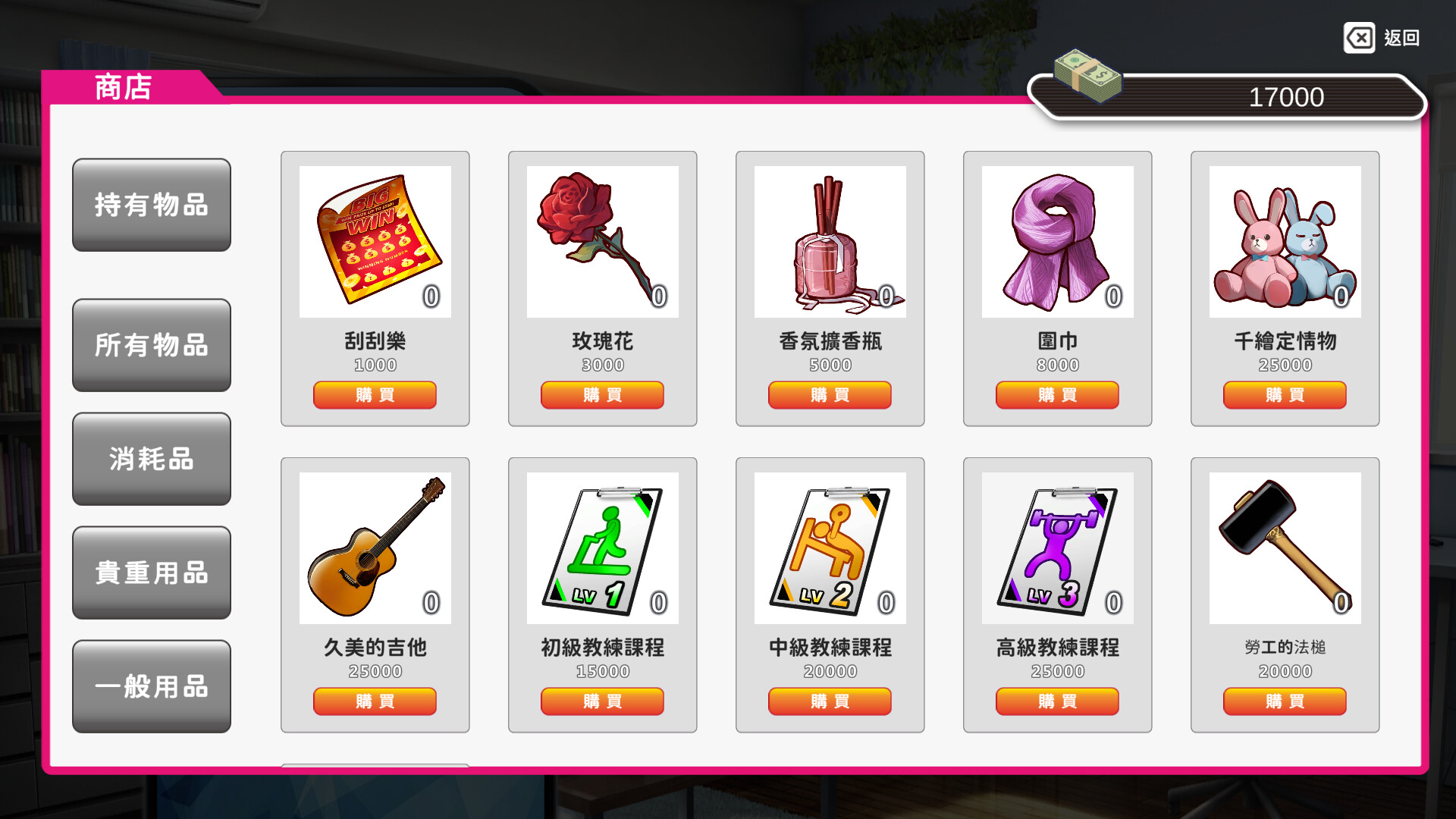 在商店中,將取得的金錢轉換成各式道具,幫助自己更快的提升,或提升女角們的好感度。