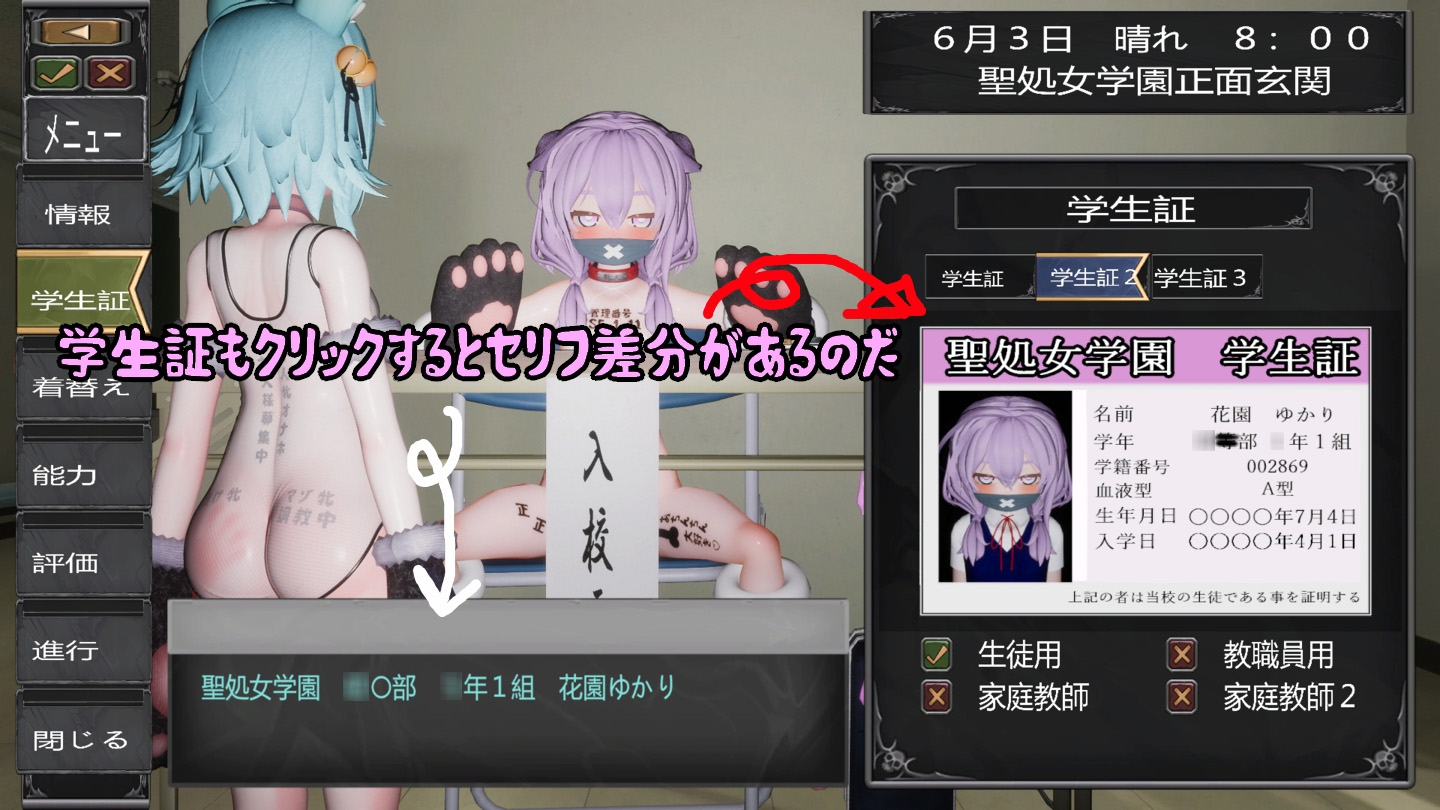 因认真顺从的性格深受教职员好评。特别获准开展校外课外活动,担任高级后援会会员专属(可无套性交)的上门家教。已加入玩〇育成课程,深度催眠完成,有性交经验,个体等级A级雌体。