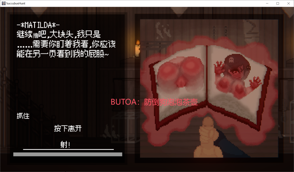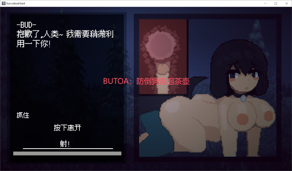 免责说明 本文由butoa原创,游戏资源转载自网络,请于下载后24时内删除。 作品介绍 你是怪物娘世界里唯一的人类男性!在充满100位病娇、可爱又饥渴的怪物娘的世界里逃窜、潜行、拼命挣扎吧~!名称: Succubus Hunt开发者: Multby6发行商: Multby6发行日期: 2025 年 1 月 22 日 《魅魔狩猎》的故事发生在一个怪物娘随处可见的世界而你是唯一的人类男性!在充满100位病娇、可爱又饥渴的怪物娘的世界里逃窜、潜行、拼命挣扎吧~!本作首先是款2D横版动作游戏!包含轻度潜行要素主打探索、遭遇战和轻度解谜还有支线任务和众多面具能解锁特殊移动方式与世界互动!200个色气动画100位可遭遇的怪物娘100+个可探索房间8个可解锁面具3场BOSS战 游戏截图 下载链接 我翻了下上次分享这游戏都是24年的事情了,时间过得真快~这次带来的是最近更新的官中版本~已解锁全画廊~感兴趣的小伙伴自行体验吧~简单介绍下按键吧,个人推荐手柄玩,按键比较舒服。键盘的话,A和D左右移动,W和S一个确认一个取消,左SHIFT疾跑,空格跳跃。(当然你也可以用上下左右键和ASDW一样,你也可以搭配着用) Steam 链接 游戏名:Succubus-Hunt 版本号:Ver1.5.2文件大小:1.74 GB上传时间:2026年01月11日 (以后在我文章下面比较好的留言,比如游戏攻略或者存档,汉化BUG汇报,游戏感想等等~会不定期送点小福利,记得留意私信哈~~) ENC文件解密程序文件需要以下程序进行第一次解密ENC解密程序下载:https://pan.baidu.com/s/1a4nNQXvtrXJVZHRffH_CkA?pwd=109j密码:acgbuster 您需登录并关注本文作者后才能阅读此隐藏内容请先登录登录立刻注册
