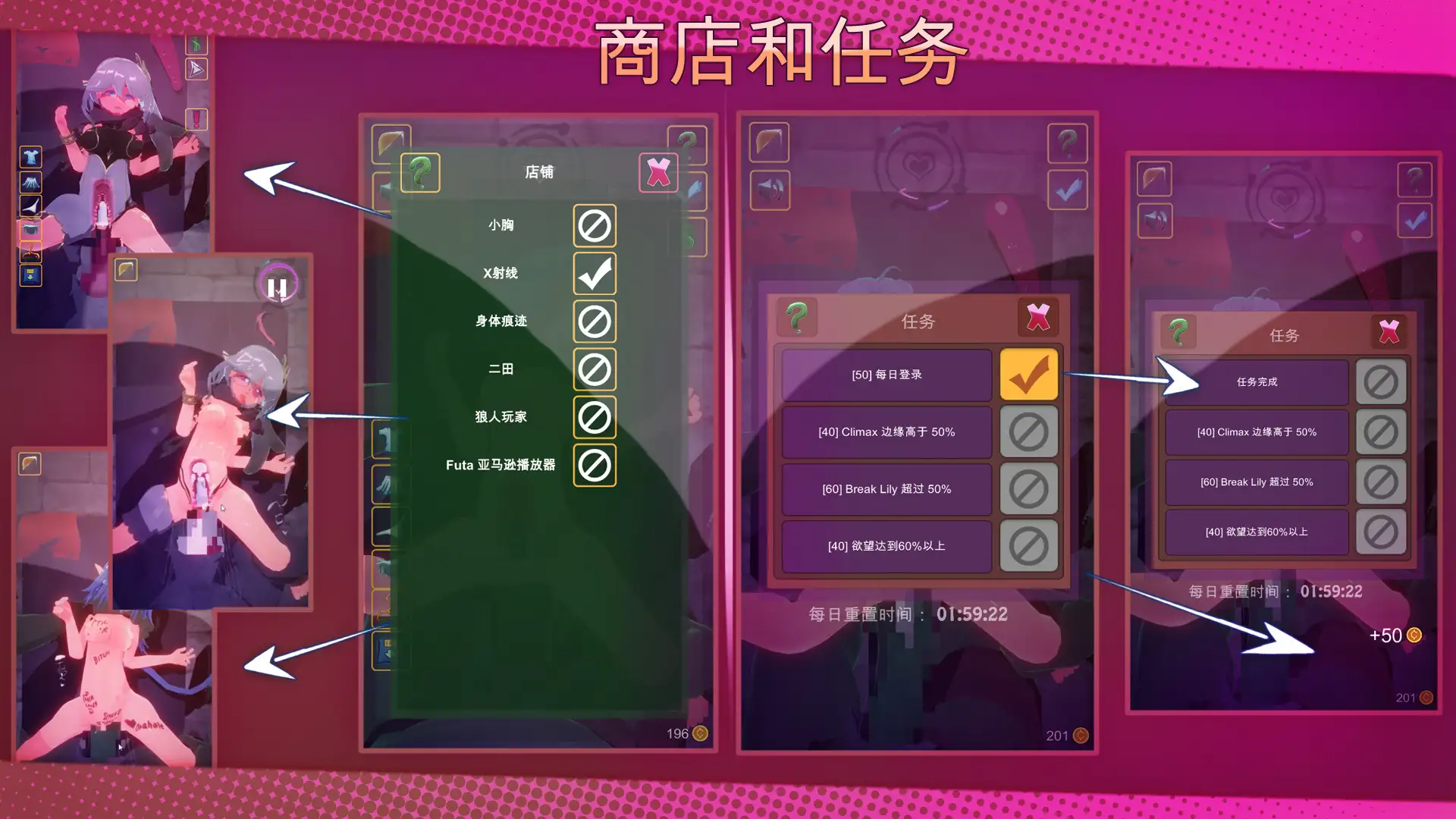 – 在游戏中的不同时间摇晃女孩的头,以获得她的特殊反应,仍然拒绝你或已经乞求更多。你也可以惩罚这个可爱的娃娃,在她处于这种状态时快速插入或拔出,以获得另一种反应和额外的刺激。